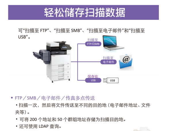 发送方式:扫描至SMB,邮箱,FTP或FTP over SSL,USB;TWAIN扫描,WSD扫描,WIA扫描